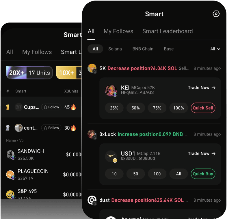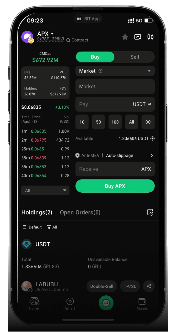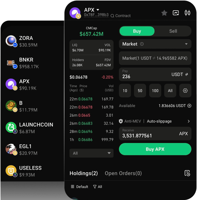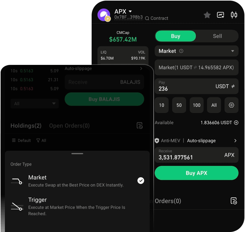 Buy crypto with USDT in one click — no native tokens needed, trade directly on-chain.