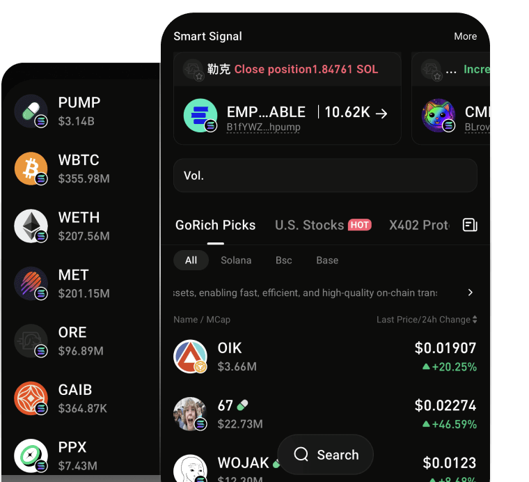GoRich Smart Money Signals provides the most comprehensive list of KOLs (Key Opinion Leaders) across the crypto space. It monitors their buy and sell activities in real-time, delivering precise trading signals to help you seize market opportunities. With one-click order placement, you can effortlessly follow KOLs’ investment moves and execute strategies quickly. Core Advantages:Comprehensive KOL List: Includes top global KOLs, such as NFT players and crypto investors, ensuring broad coverage.Real-Time Monitoring: Tracks KOL trading behavior 24/7 to capture every opportunity.Instant Signals: Delivers immediate buy/sell notifications for faster decision-making.One-Click Trading: Simplifies the process, allowing seamless execution of KOL-inspired trades to boost investment efficiency.