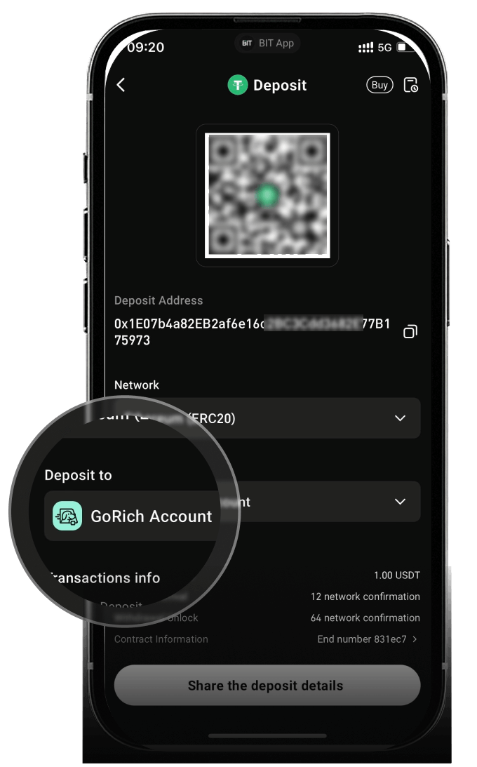 On the GoRich homepage or the [Assets] page, select [Deposit] or [Transfer].Deposit: Directly fund your GoRich account with supported assets (BNB, ETH, SOL, USD, USDT).Transfer: Move funds from your Bit.com funding account to your GoRich account. Fund Transfer Guide