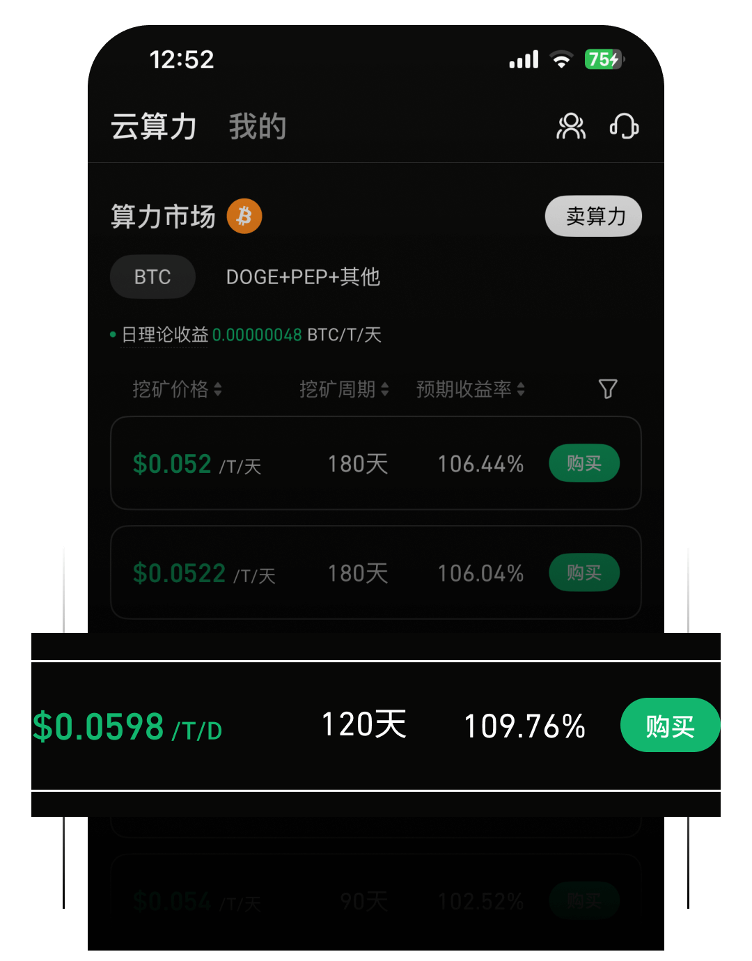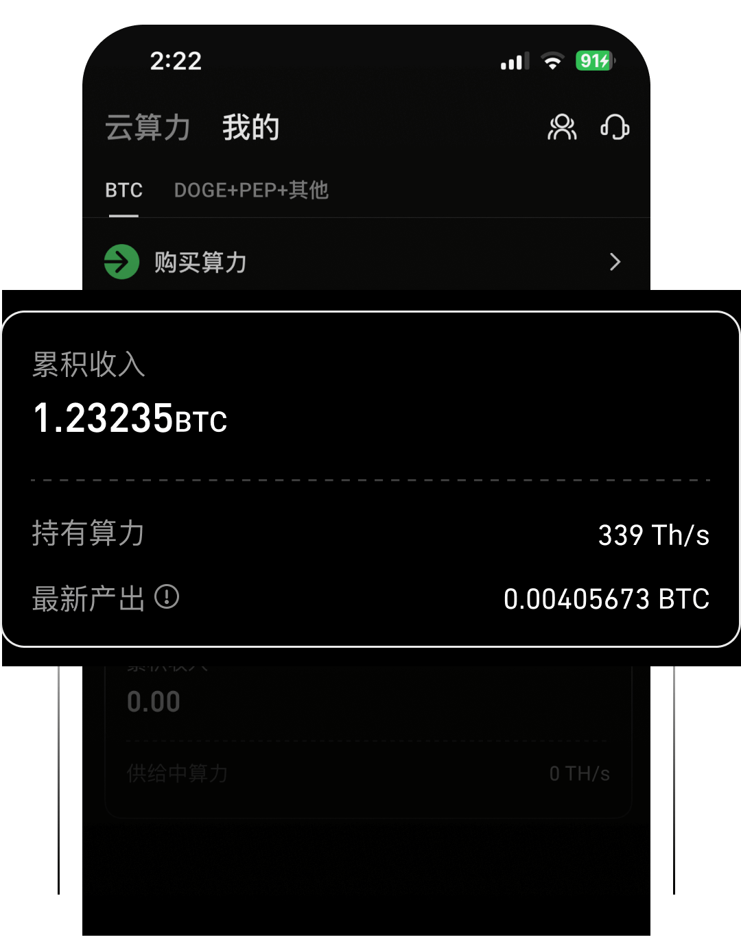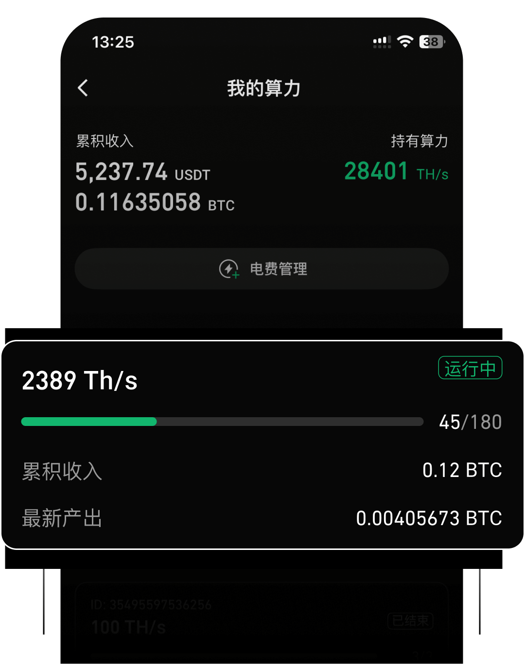 挖矿收益 = 过去24小时每算力单位的挖矿收益 * 订单算力值 数据来源:平台每日挖矿收益数据参考全球领先矿池的数据,包括 ANTPOOL、F2POOL、Luxor 等行业知名矿池的每日数据。