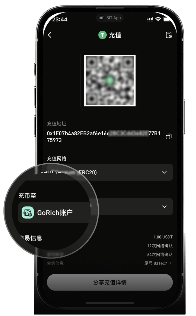 在 GoRich 首页,选择【充值】或【划转】;或者在【资产】页面,选择【充值】或【划转】即可。