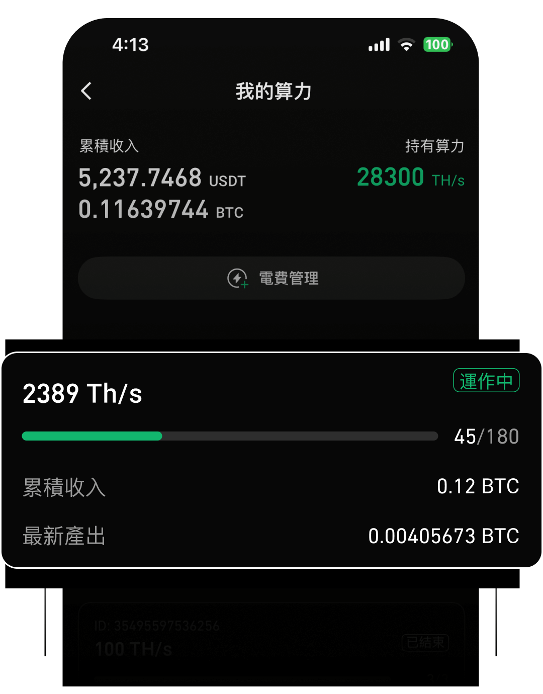 挖礦收益 = 過去24小時每算力單位的挖礦收益 * 訂單算力值 數據來源:平台的每日挖礦收益數據參考全球領先礦池的數據,包括 ANTPOOL、F2POOL、Luxor 等行業知名礦池的每日數據。